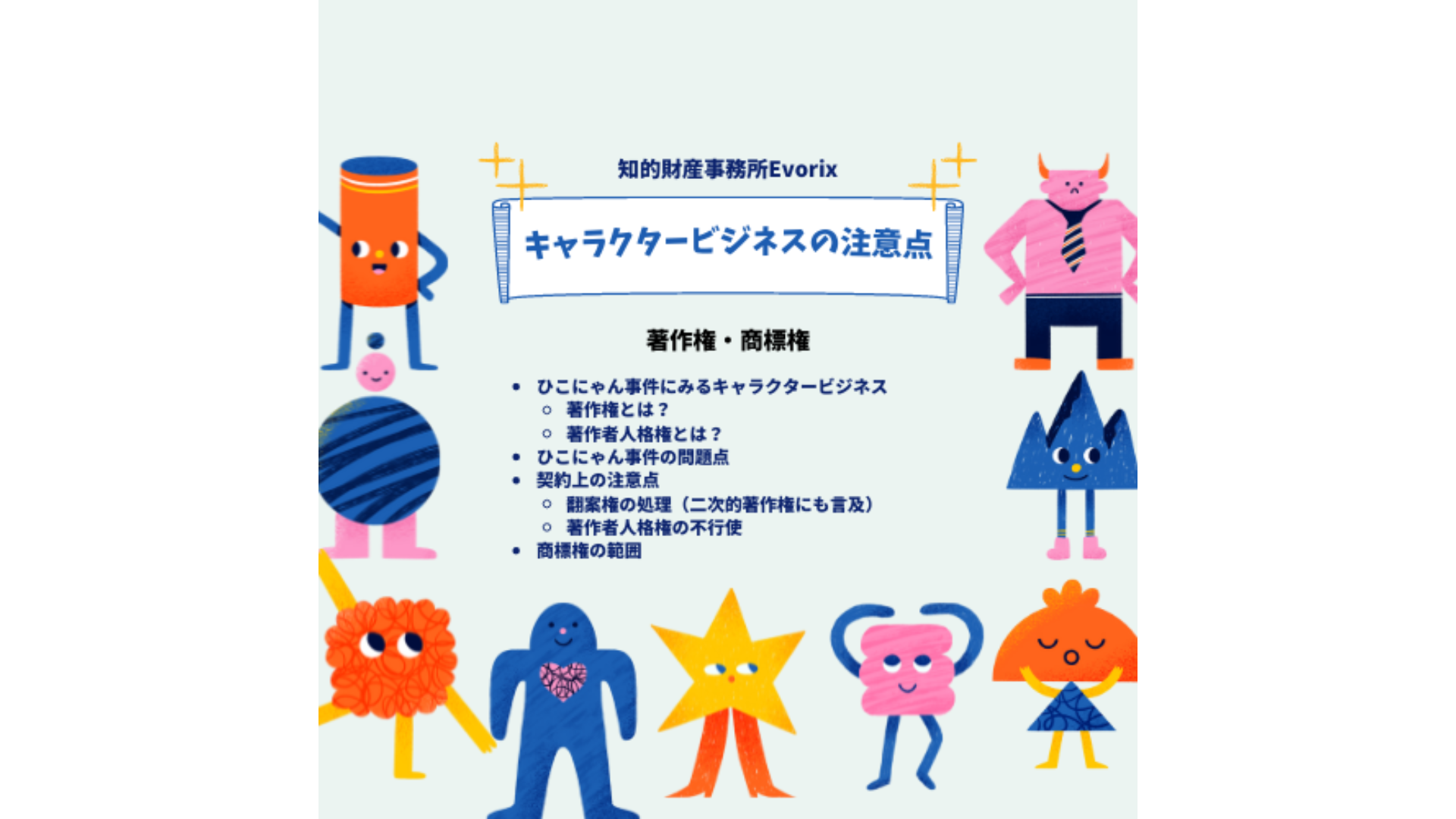 キャラクターデザインについては、著作権の権利処理をキチンと行った上で商標登録を行い、円滑にビジネスに使用できるように注意しましょう。弊所では著作権のご相談も受け付けております。気になる点があればご相談ください。